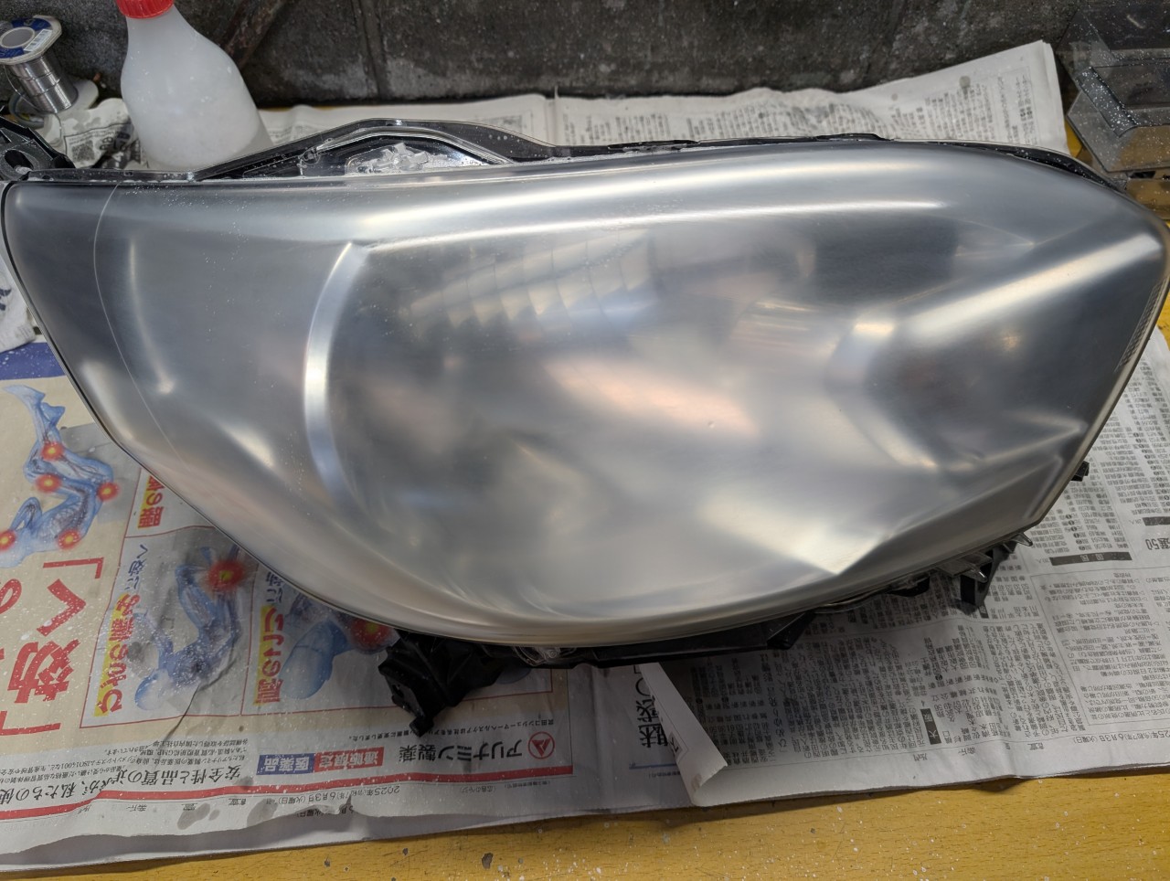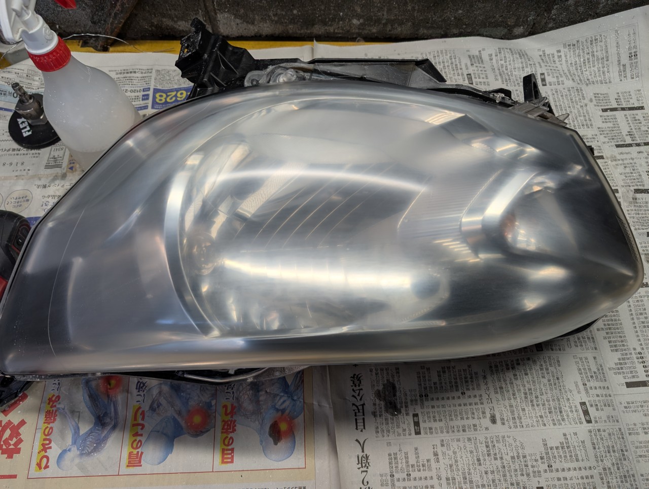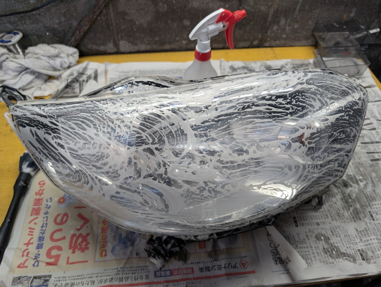 研磨と洗浄が完了したあと、ヘッドライトにクリア塗装を行います。