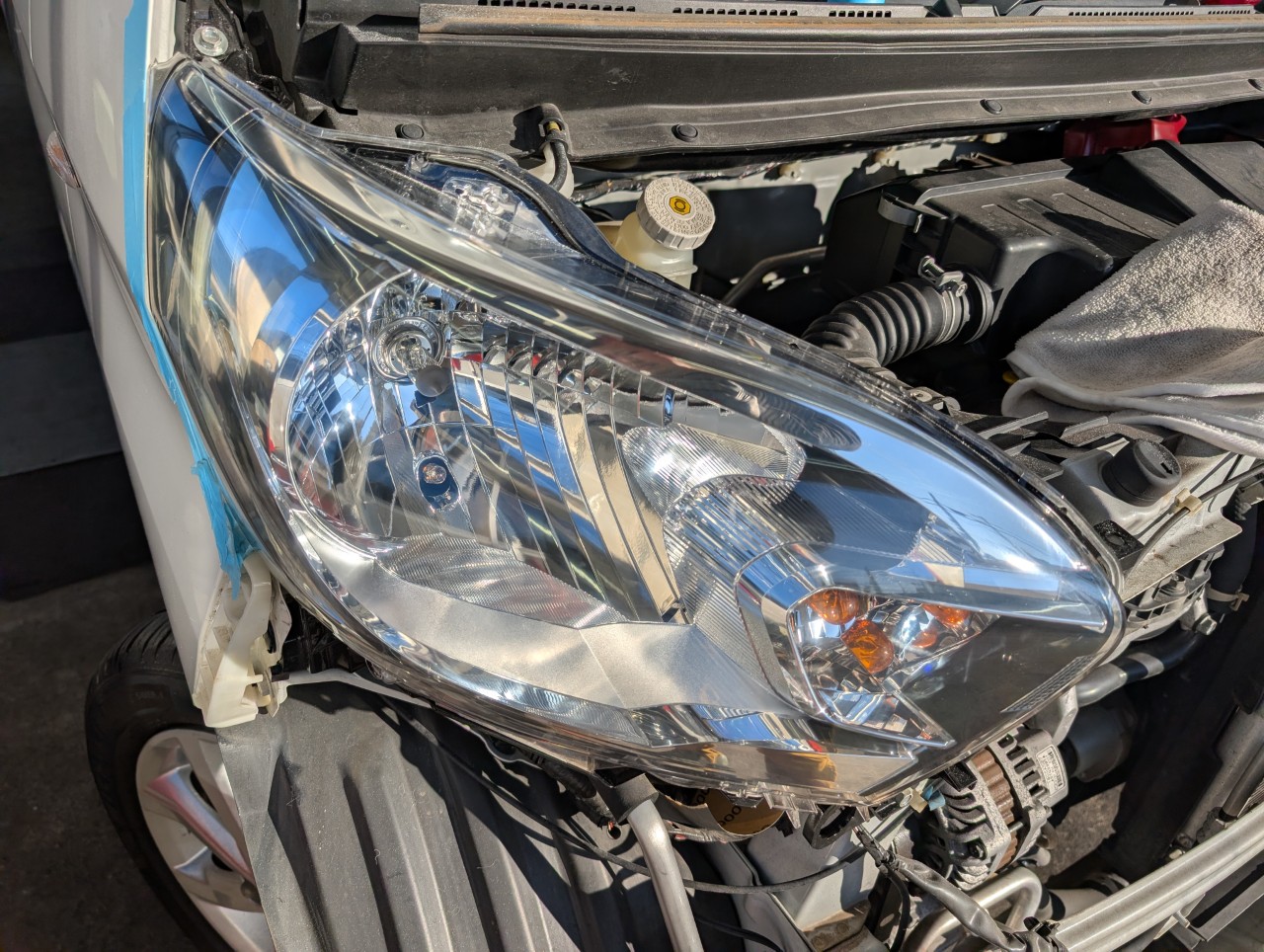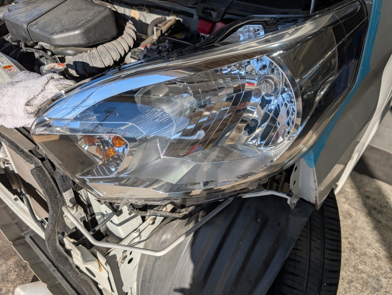 クリア塗料の乾燥後、ヘッドライトを車両へ取り付けます。