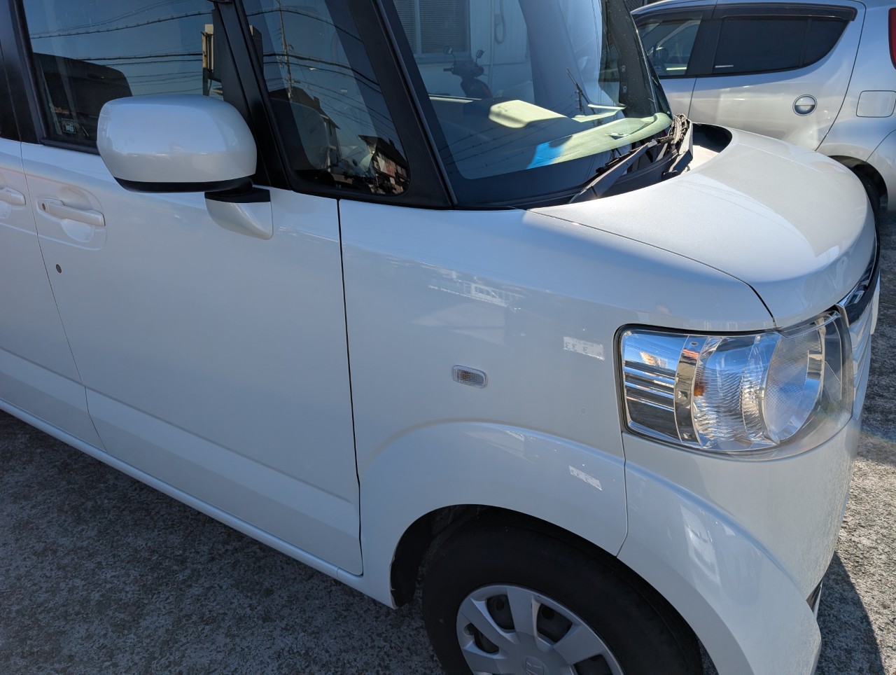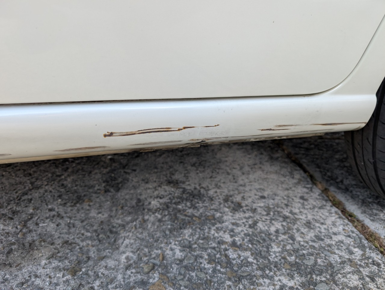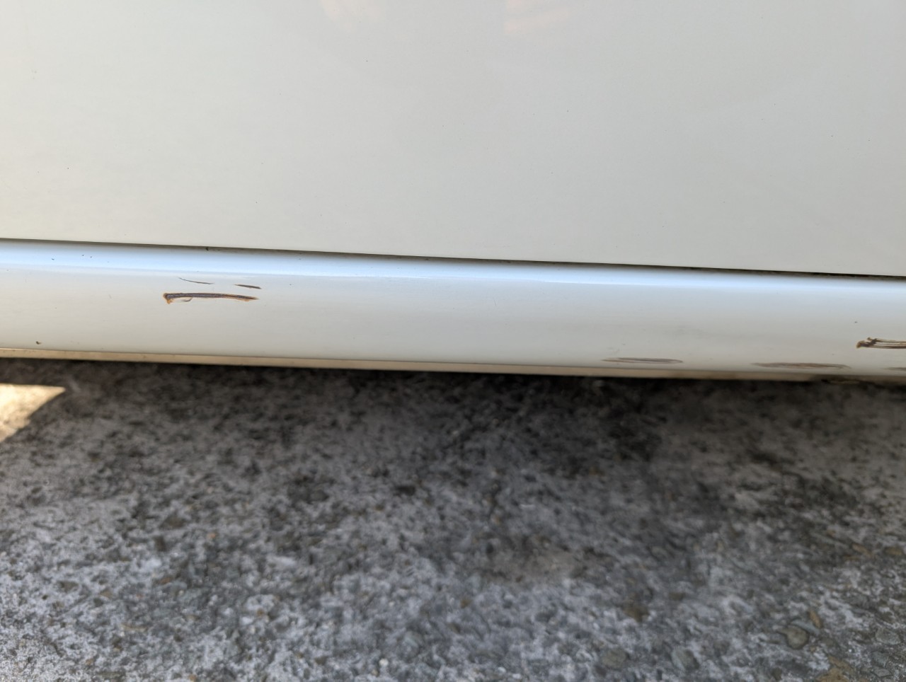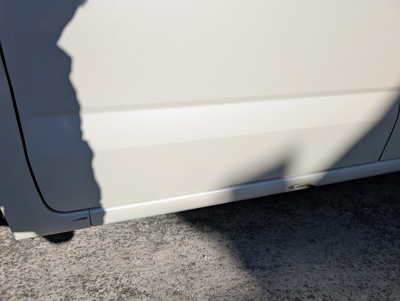 左の下側の外装に凹みサビあり。板金すると原価が高くなるのでタッチペンで補修します。 - ヘッドライドをクリア塗装しましたので、数年間は黄ばみとは無縁かと思います。